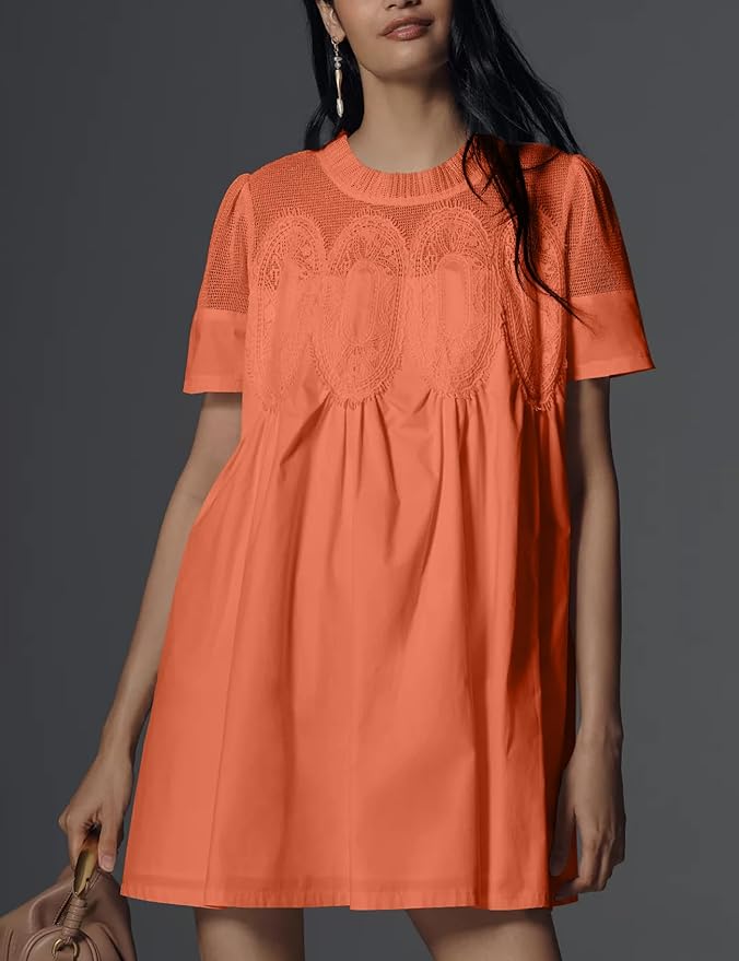 A chic twist on the classic babydoll, this vibrant orange dress features intricate lace panels across the chest and shoulders, adding texture and elegance. The rest of the dress flows into a loose, airy silhouette, ideal for hot days when comfort is key. With its short sleeves and high neckline, it’s modest yet stylish. Wear it for city strolls, brunch, or casual evenings with flat sandals or slip-ons.