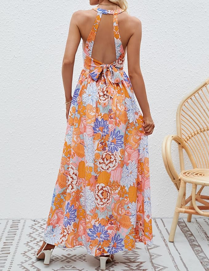This backless halter dress showcases a vibrant floral print in bright orange, pink, lilac, and white tones — perfect for vacation vibes. Featuring a high halter neckline and an open back with a bow tie detail, it strikes the perfect balance between playful and elegant. The flowy maxi length makes it ideal for beach dinners, weddings, or tropical getaways. Style it with wedges and a simple necklace to complete the look.